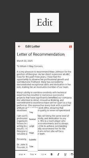 Our intuitive app streamlines the whole process of creating impactful recommendation letters. Simply input the needed info about the person you are recommending, such as their name, your relationship to them, and their key qualifications. The application then generates a well-structured draft that you can fully edit to personalize the content and ensure it accurately reflects your insights. This ability to customize the generated text is crucial for creating a genuine and effective letter.